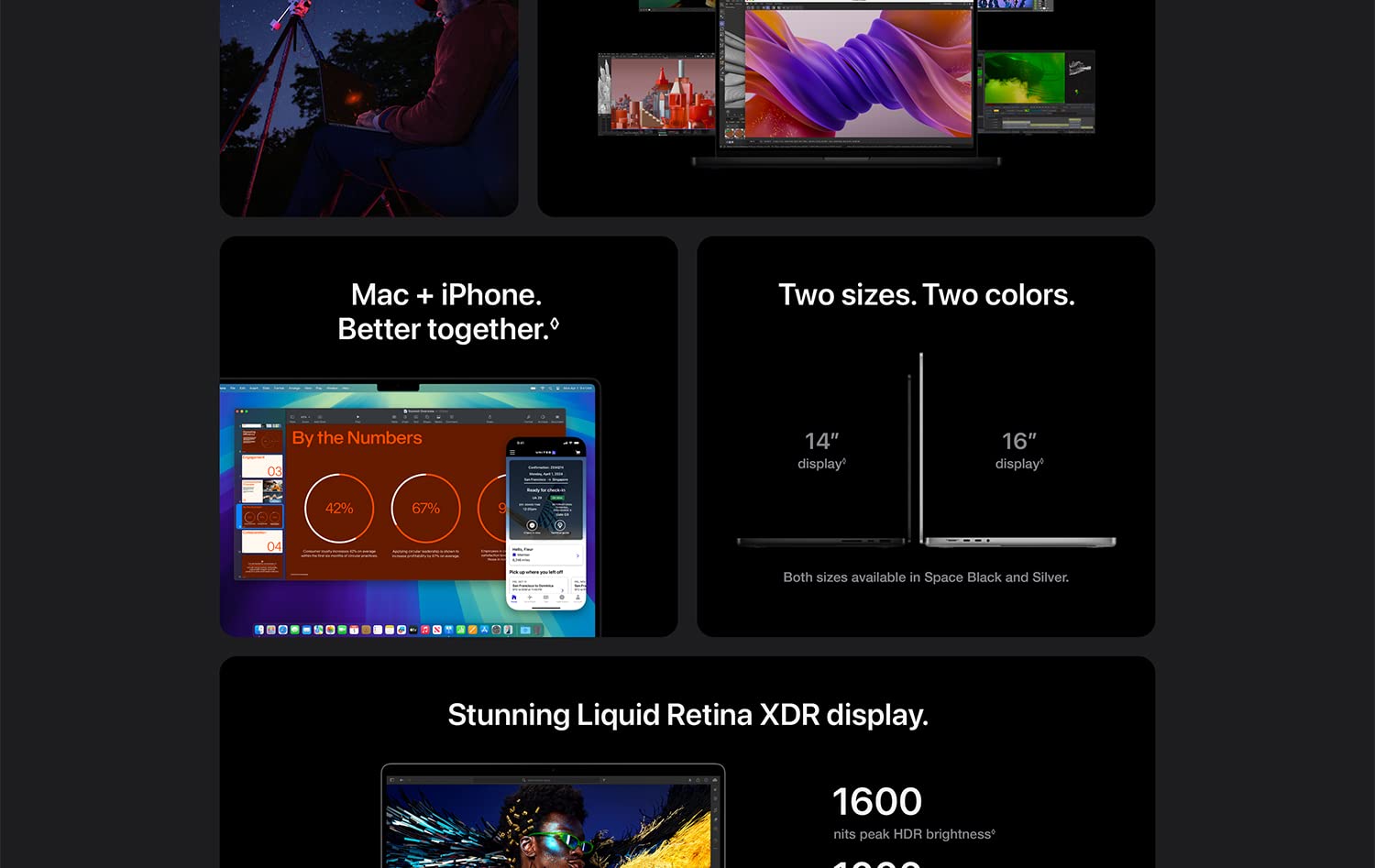 - BRILLIANT PRO DISPLAY — The 14.2-inch Liquid Retina XDR display features 1600 nits peak brightness, up to 1000 nits sustained brightness, and 1,000,000:1 contrast.*