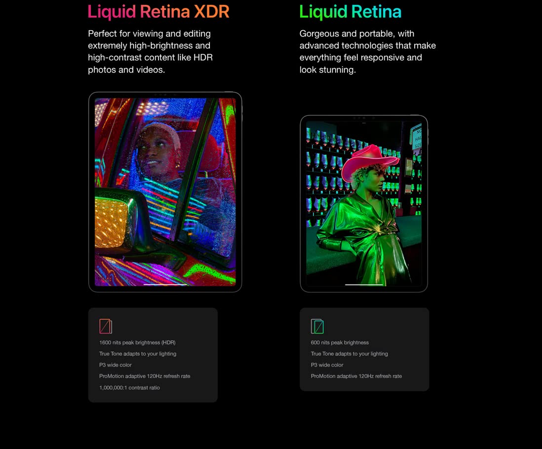 Extreme dynamic range on the 12.9-inch iPad Pro.³ The Liquid Retina XDR display delivers true-to-life detail with a 1,000,000:1 contrast ratio, great for viewing and editing HDR photos and videos or enjoying your favorite movies and TV shows. It also features a breathtaking 1000 nits of full‑screen brightness and 1600 nits of peak brightness along with advanced display technologies like P3 wide color, True Tone, and ProMotion. And you can use Reference Mode for a more color-accurate workflow.