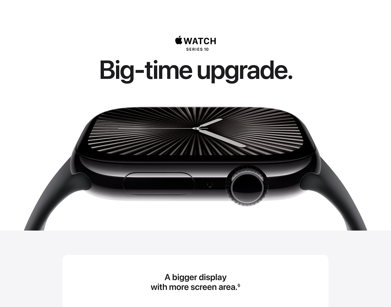 - WHY APPLE WATCH SERIES 10 — Bigger display with up to 30 percent more screen area.* A thinner, lighter, and more comfortable design.* Advanced health and fitness features provide invaluable insights.* Safety features connect you to help when you need it.* Faster charging gives you 80 percent battery in about 30 minutes.*