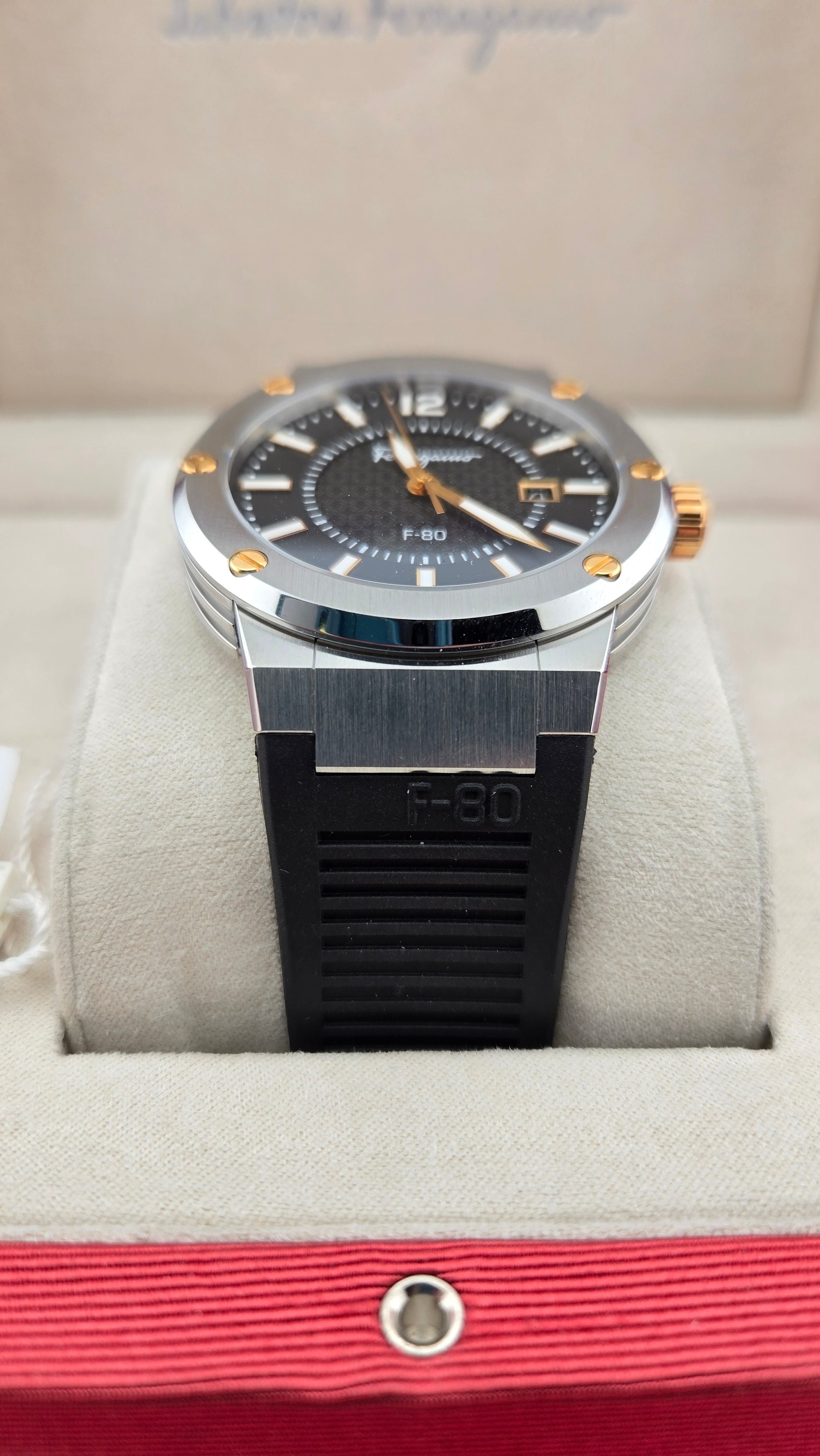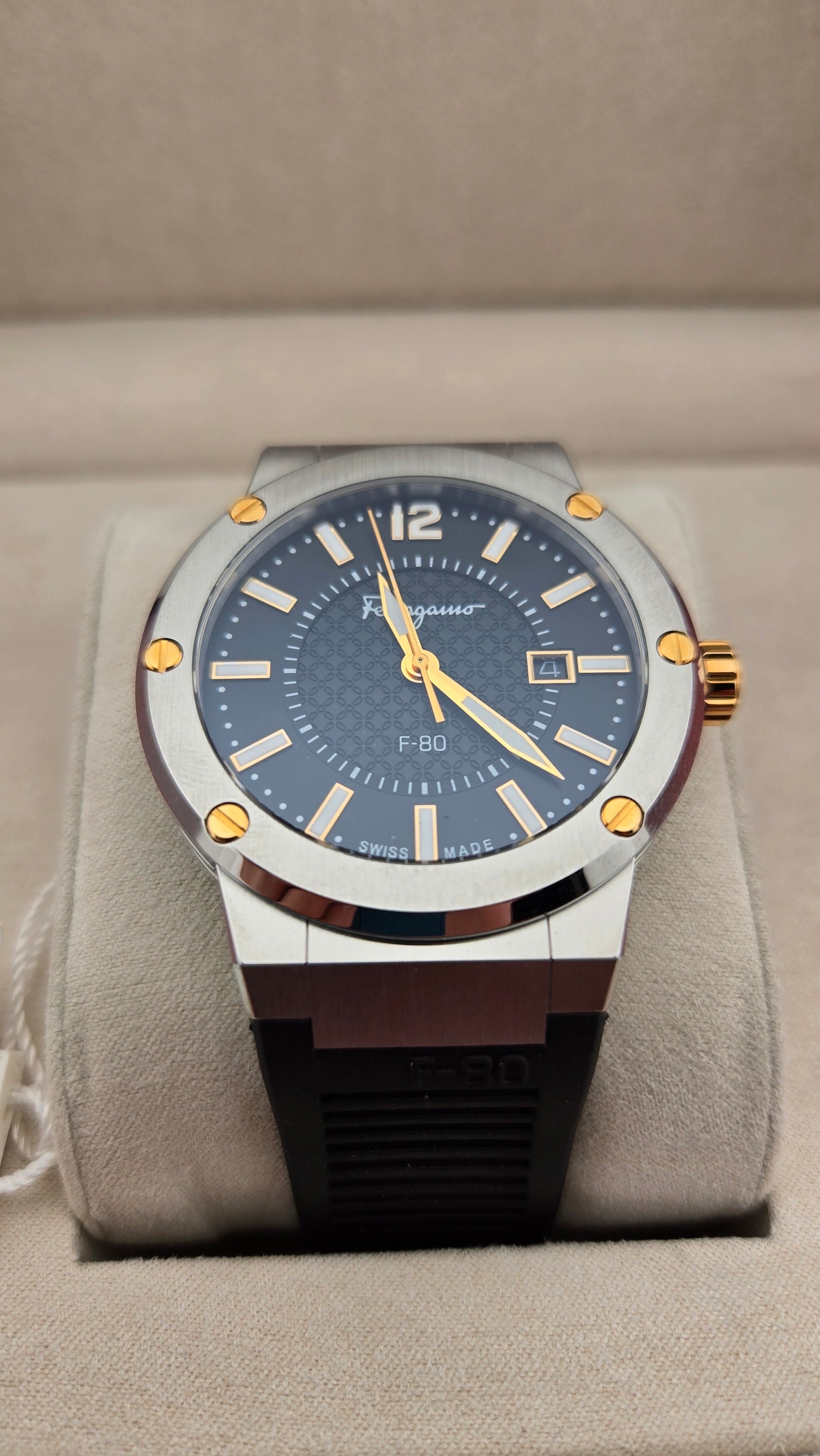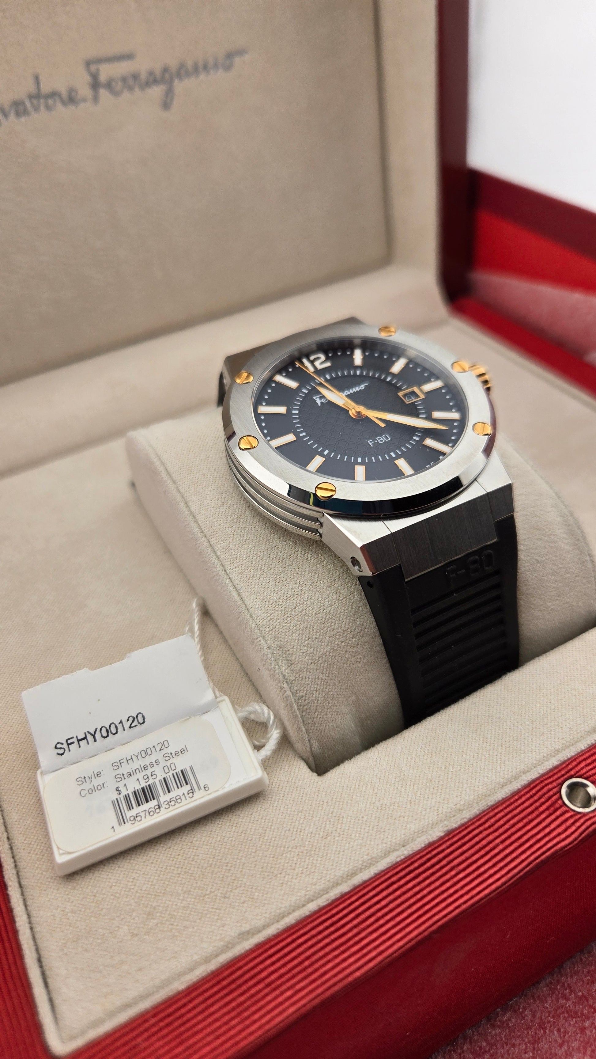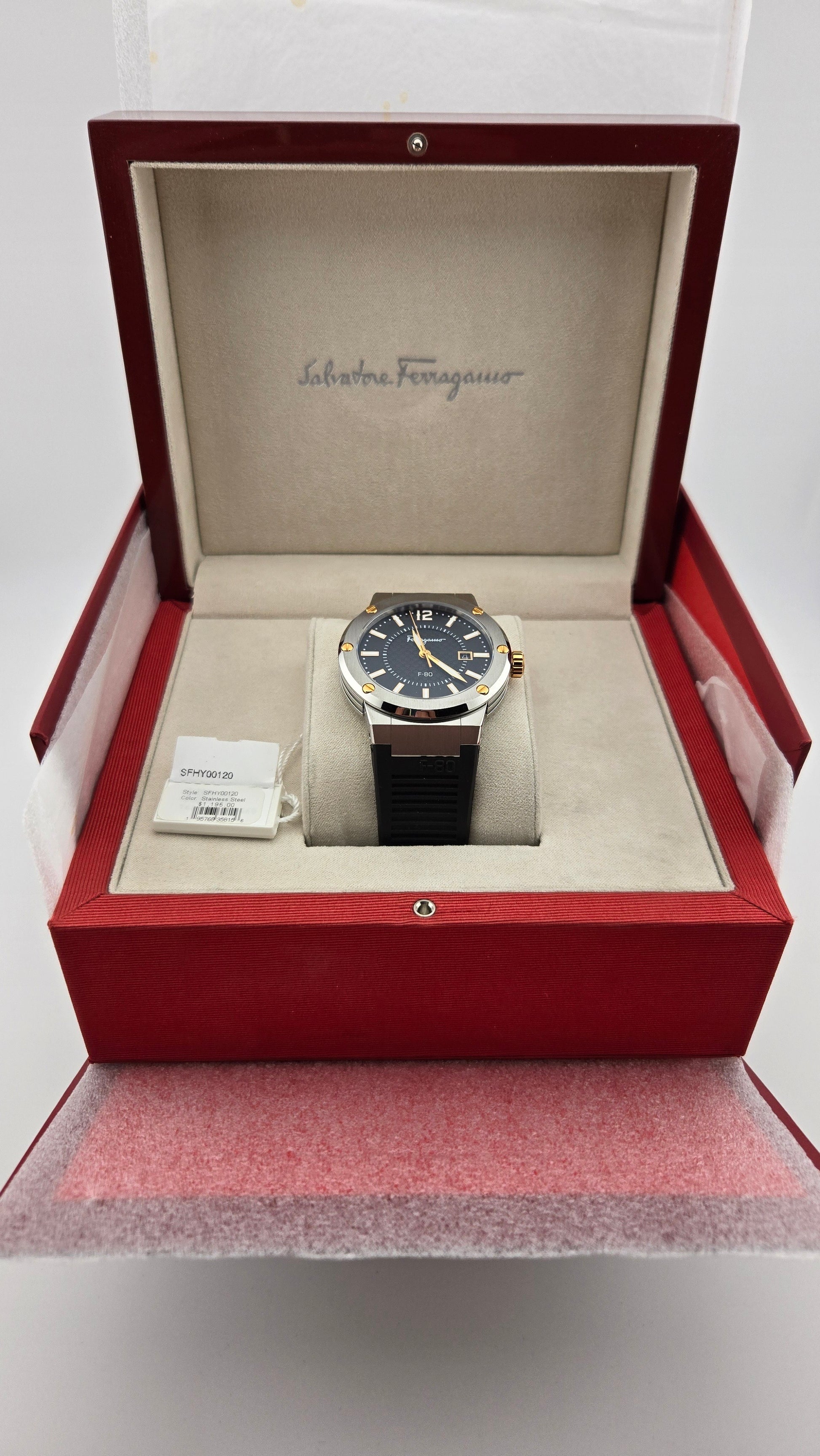 Silver-tone stainless steel case with a black rubber strap. Fixed silver-tone stainless steel bezel. Black dial with gold-tone hands and index-Arabic numeral hour markers. Minute markers around the outer rim. Dial Type: Analog. Date display at the 3 o'clock position. Quartz movement. Scratch resistant sapphire crystal. Pull / push crown. Round case shape, case size: 44 mm, case thickness: 10.3 mm. Band width: 16.5 mm. Deployant clasp. Water resistant at 100 meters / 330 feet. Functions: date, hour, minute, second. F-80 Series. Casual watch style. Watch label: Swiss Made. Salvatore Ferragamo F-80 Quartz Black Dial Men's Watch SFHY00120.