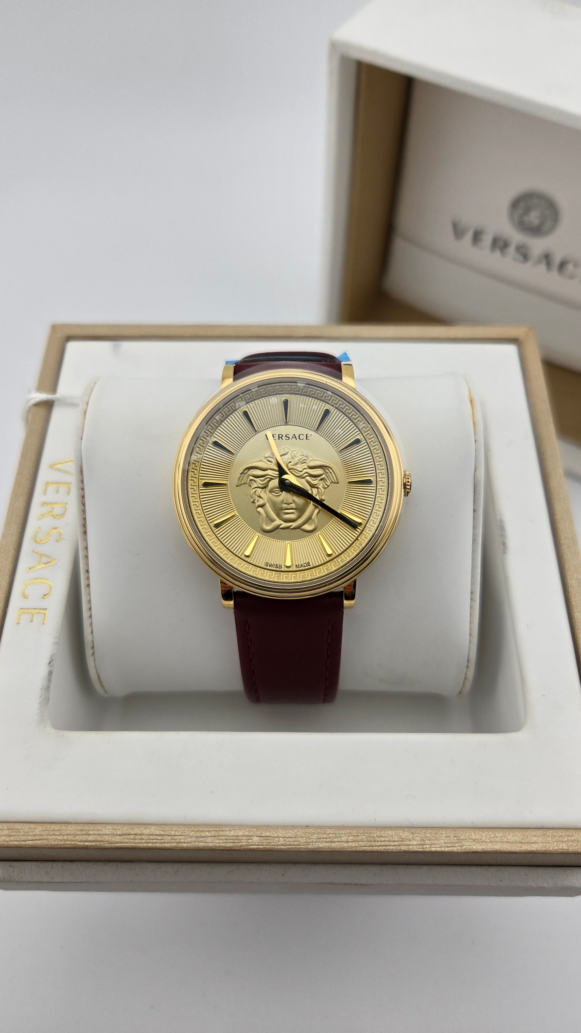 The Versace V‑Circle VE8103821 is a chic and sophisticated women’s dress watch that exudes Italian luxury. Featuring a 38 mm gold‑tone stainless steel case adjourned by a rich burgundy leather strap, this Swiss‑made quartz timepiece features a striking gold dial adorned with the iconic Medusa motif.